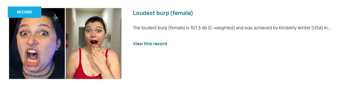 This page will be dedicated to my world record for Loudest Women’s Burp! I am super proud of myself for making this happen and it’s possible that one day I will attempt to break the record again! Thank you to everyone that suggested I attempt this world record!